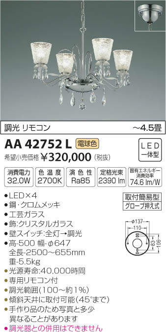 サイズ:高さ500 幅φ647 全長2500〜655mm 重さ:5.5kg 消費電力:32W 色温度:2700K 演色性:Ra85 光源寿命:40,000時間 専用リモコン付 調光範囲(100〜約1%) 傾斜天井に取付可能(45°まで) 手作り品のため写真と多少異なることがあります 調光器との併用はできません ※色温度:2700K 材質・色:鋼-クロムメッキ、工芸ガラス、飾 クリスタルガラス ランプ:LED×4 LEDユニット:LED一体型 点灯順序:壁スイッチ:全灯→調光 電気工事:電気工事不要タイプ メーカー希望小売価格はメーカーカタログに基づいて掲載しています