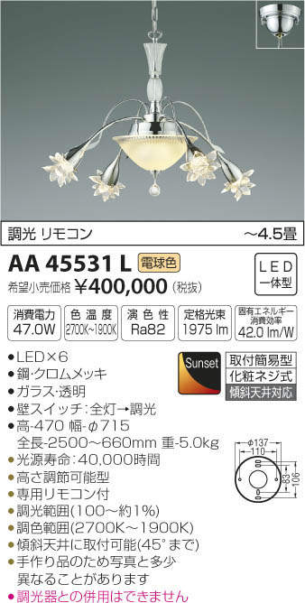 商 品 詳 細商品名コイズミ インテリア 屋内 照明メーカー名コイズミ KOIZUMIメーカー器具名称シャンデリア(装飾照明)仕様サイズ高-470 幅-φ715 全長-2500〜660mm 重-5.0kg補足・注意事項◆消費電力:47W◆色温度:2700K◆演色性:Ra82◆光源寿命:40,000時間◆高さ調節可能型◆専用リモコン付◆調光範囲(100〜約1%)◆調色範囲(2700K〜1900K)◆傾斜天井に取付可能(45°まで)◆手作り品のため写真と多少異なることがあります◆調光器との併用はできません※色温度:2700K〜1900K注意事項◆写真方向以外取り付け不可 ※施工・電気工事は専門業者にご依頼ください。