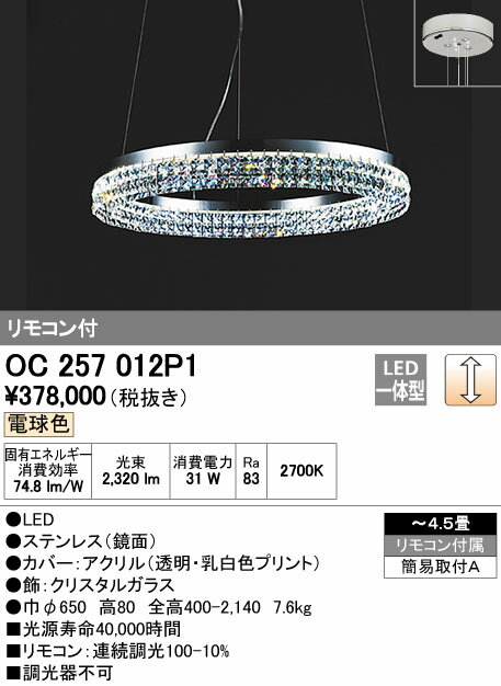 照明 おしゃれ シンプル モダン LEDオーデリック ODELIC シャンデリアOC257012P1 電球色きらめくクリスタルリング スワロフスキー 調光・〜4.5畳
