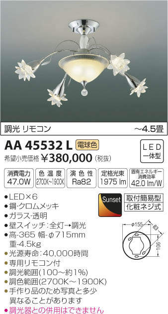 商 品 詳 細商品名コイズミ インテリア 屋内 照明メーカー名コイズミ KOIZUMIメーカー器具名称シャンデリア(装飾照明)仕様サイズ高-365 幅-φ715mm 重-4.5kg補足・注意事項◆消費電力:47W◆色温度:2700K◆演色性:Ra82◆光源寿命:40,000時間◆専用リモコン付◆調光範囲(100〜約1%)◆調色範囲(2700K〜1900K)◆手作り品のため写真と多少異なることがあります◆調光器との併用はできません※色温度:2700K〜1900K注意事項◆写真方向以外取り付け不可 ※施工・電気工事は専門業者にご依頼ください。