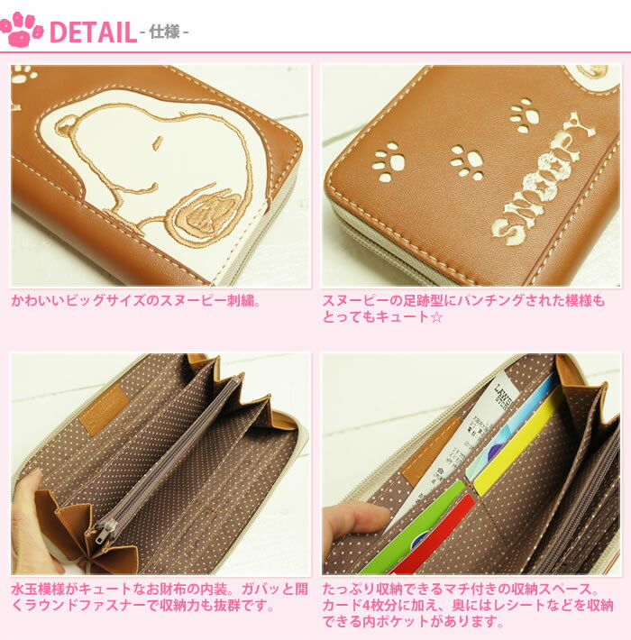 ギフト対応 スヌーピー刺繍&足跡パンチングがキュートなお財布 大きなスヌーピーのかわいい顔が刺繍されたレディースウォレット。